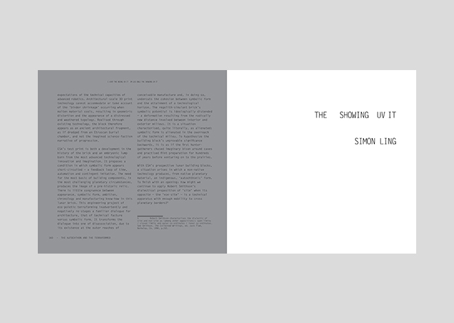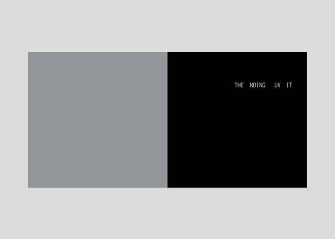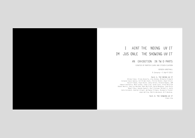First edition published by Bergen Kunsthall, Norway, 2017, on the occasion of the exhibitions ‘The Noing Uv It’, Bergen Kunsthall, 9 January – 15 February 2015 and ‘The Showing Uv It’, Simon Ling, Bergen Kunsthall, 27 February – 5 April 2015. Curated by Martin Clark and Steven Claydon. Editors: Martin Clark, Steven Claydon; 230pp; 230x236mm; 148 images; 2-colour soft cover with embossing. Texts by Martin Clark, Steven Claydon, Timothy Morton, Martin Herbert, Russell Hoban and Martin Westwood.