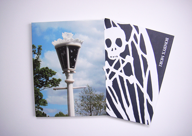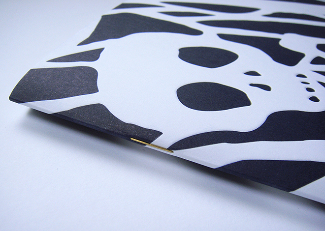 As detailed by the printer (Calverts of London): ‘The brochure has a gatefolded 8pp cover, printed in one pantone colour on 300gsm Arcoprint Extra White, with all the type and white-out elements cylinder embossed. The texts and images are on a lighter weight Arcoprint and 150gsm Hello Silk, collated as long 8pp spreads and then hand gatefolded to close, with brass wire stitches in the spine’.