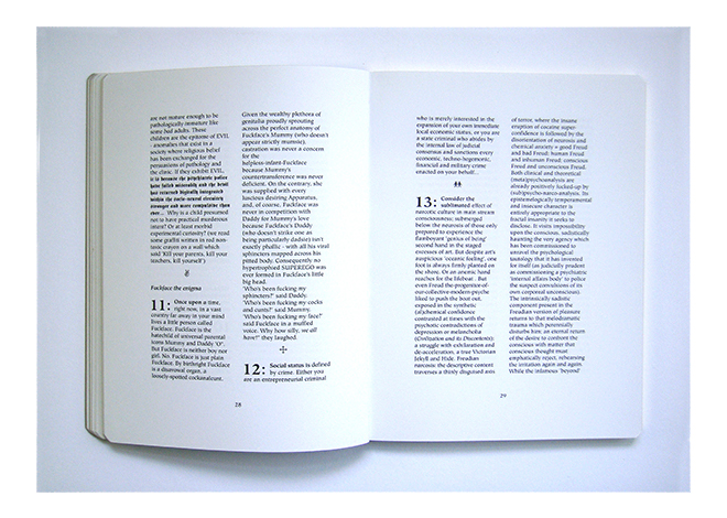 For their first major U.S. exhibition (‘Six Feet Under’ Gagosian Gallery, New York, USA, September 13-October 11, 1997) Jake and Dinos Chapman asked SecMoCo to design the accompanying publication. More than a catalogue, it was seen as a stand alone edition developing the themes and concerns of the work, as such the design took a blasphemous turn, adopting the form of the helpful reading material you could once find in the drawer of any hotel room bedside cabinet.